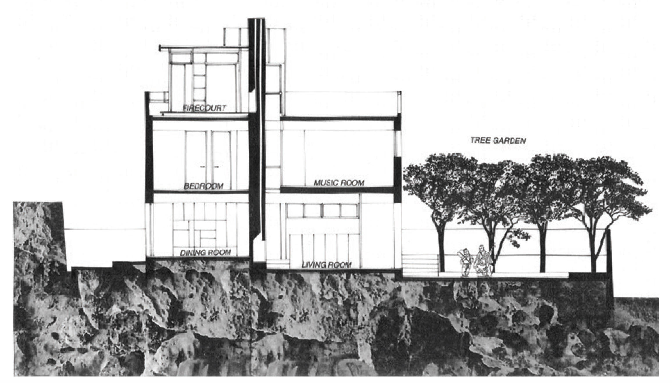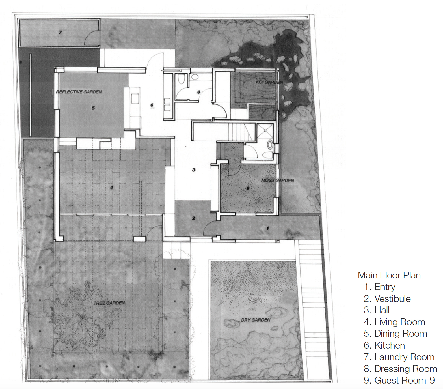 Horizontal surfaces of wood and plaster wall organize the internal mass of the house while cleft-split local stone held by steel frames accentuated with teak wood doors and windows organizing the external mass. Wood shutters designed to be integrated to the openings can be dropped down when a typhoon approaches.