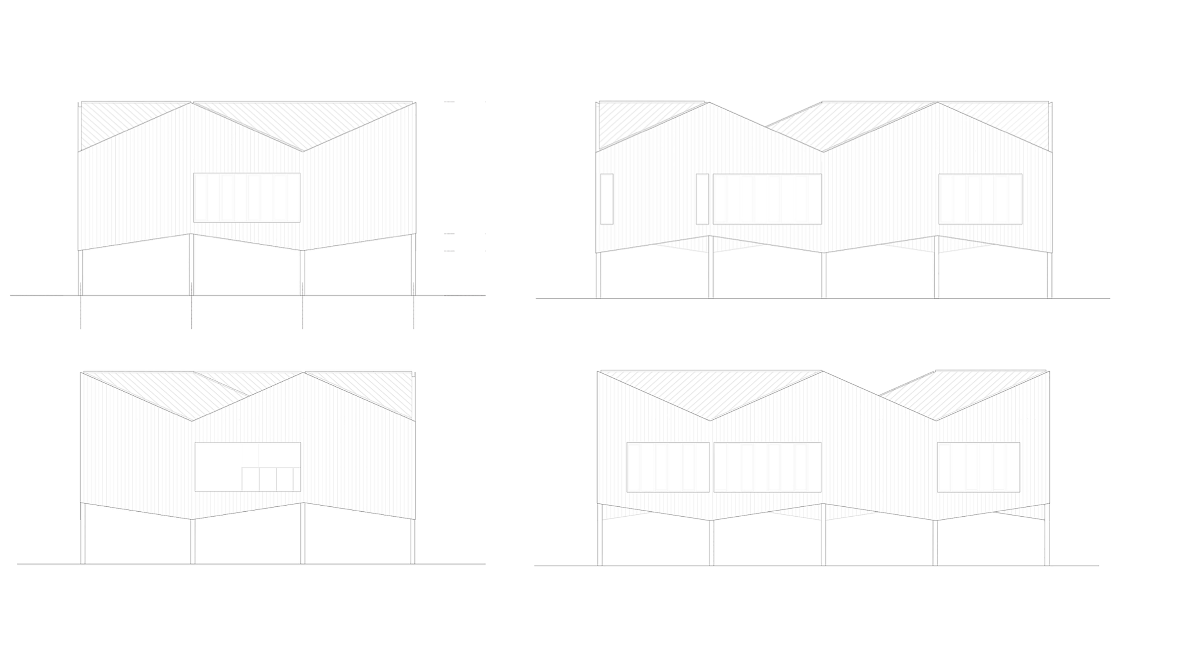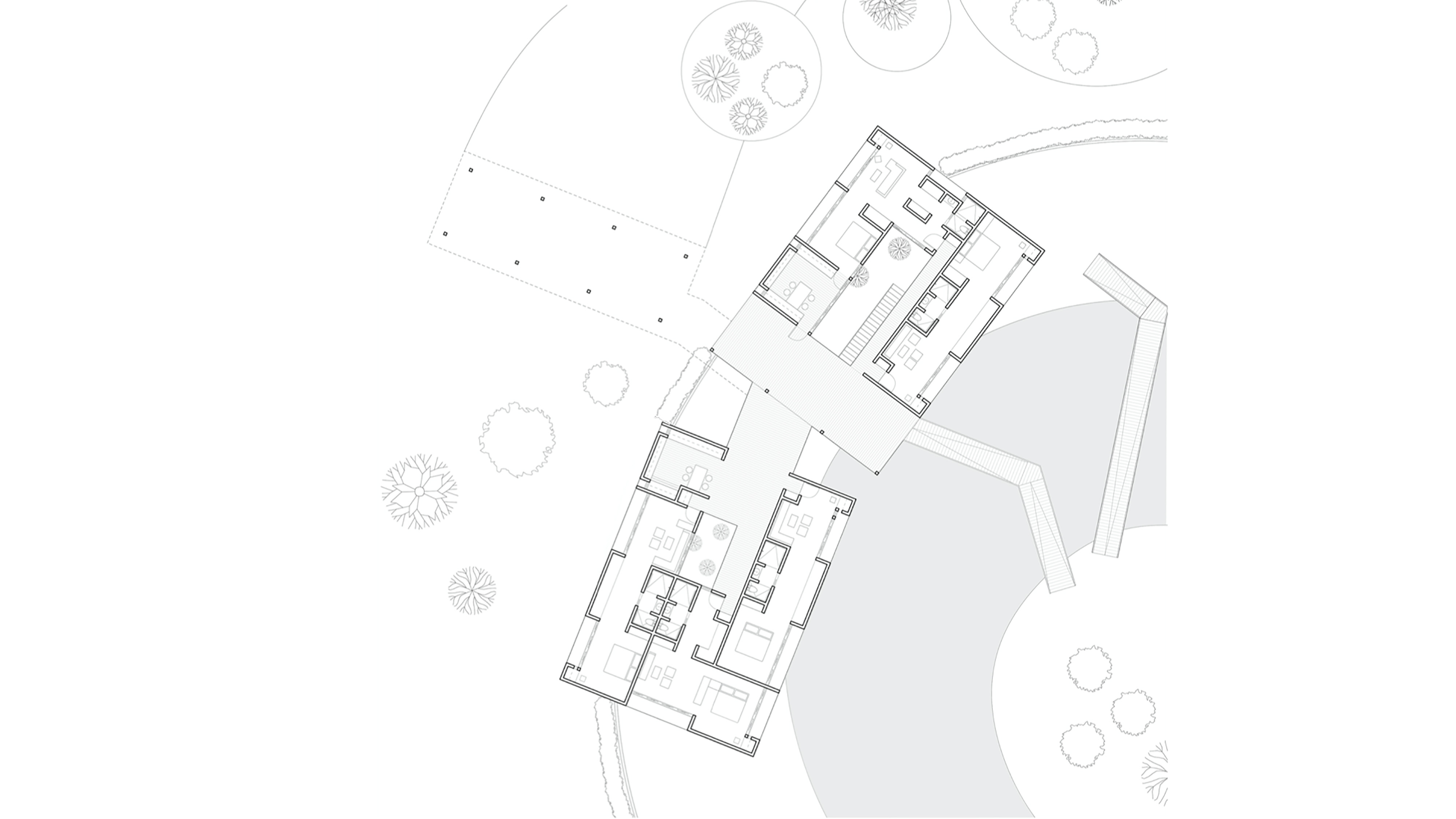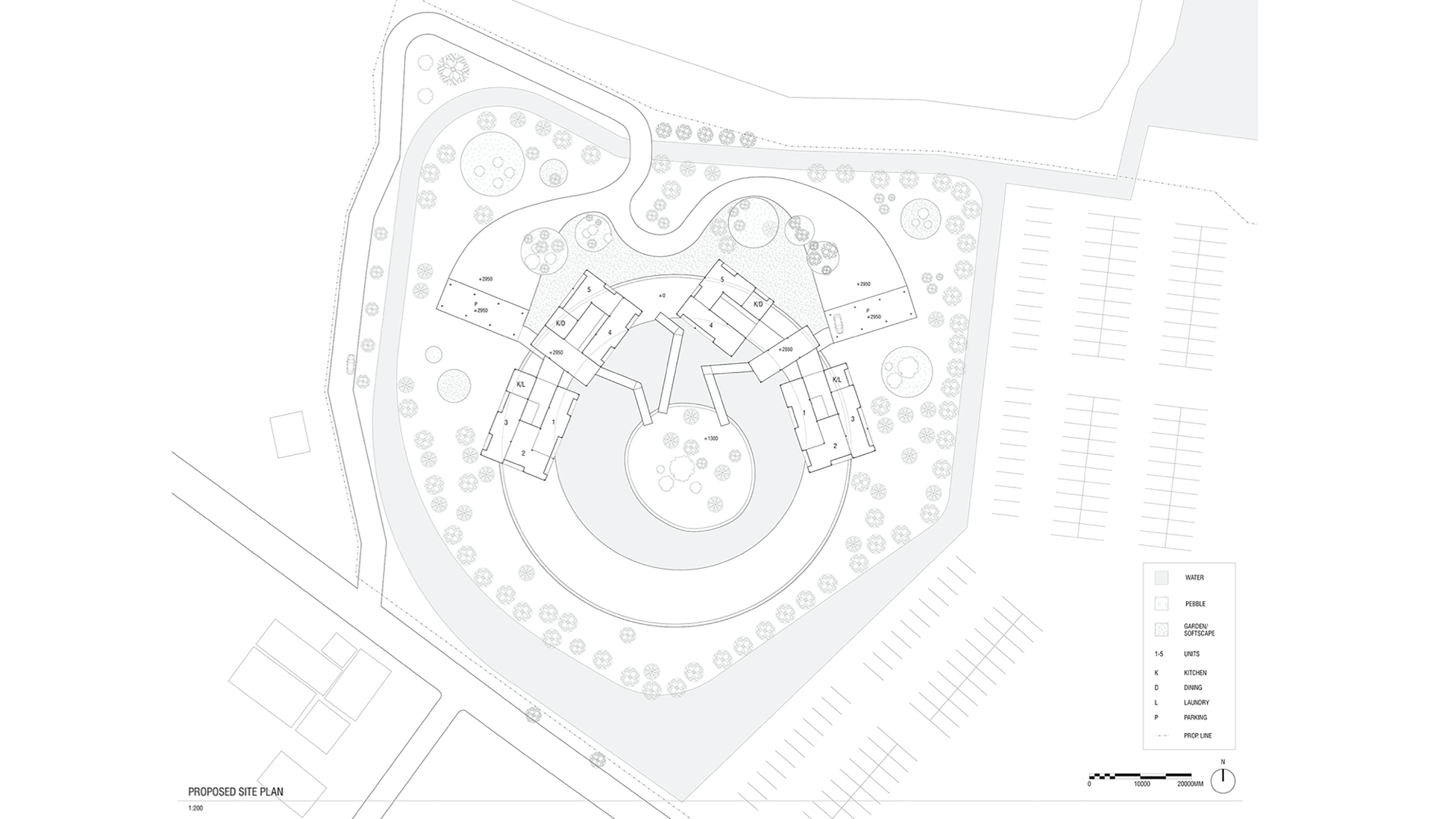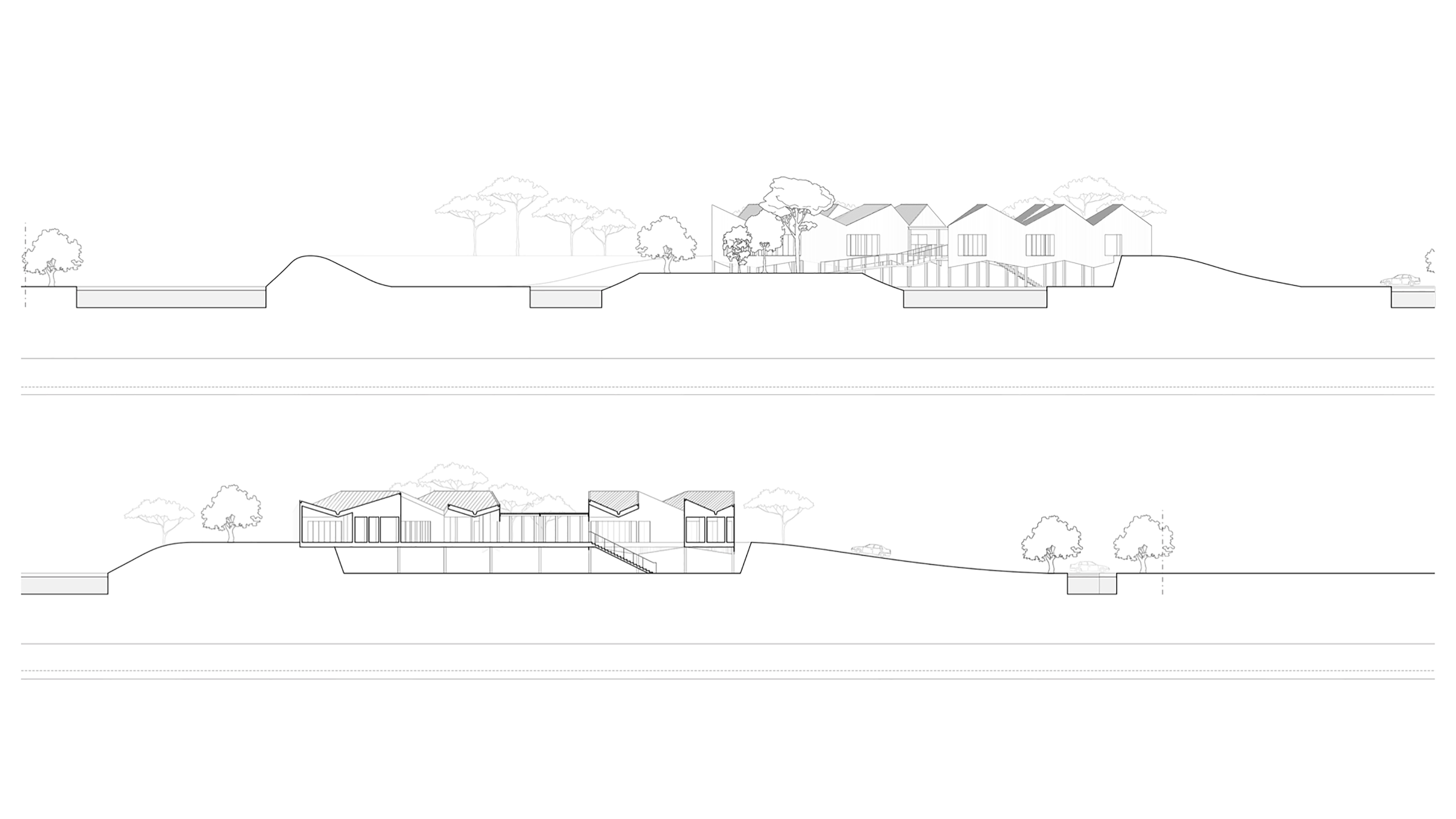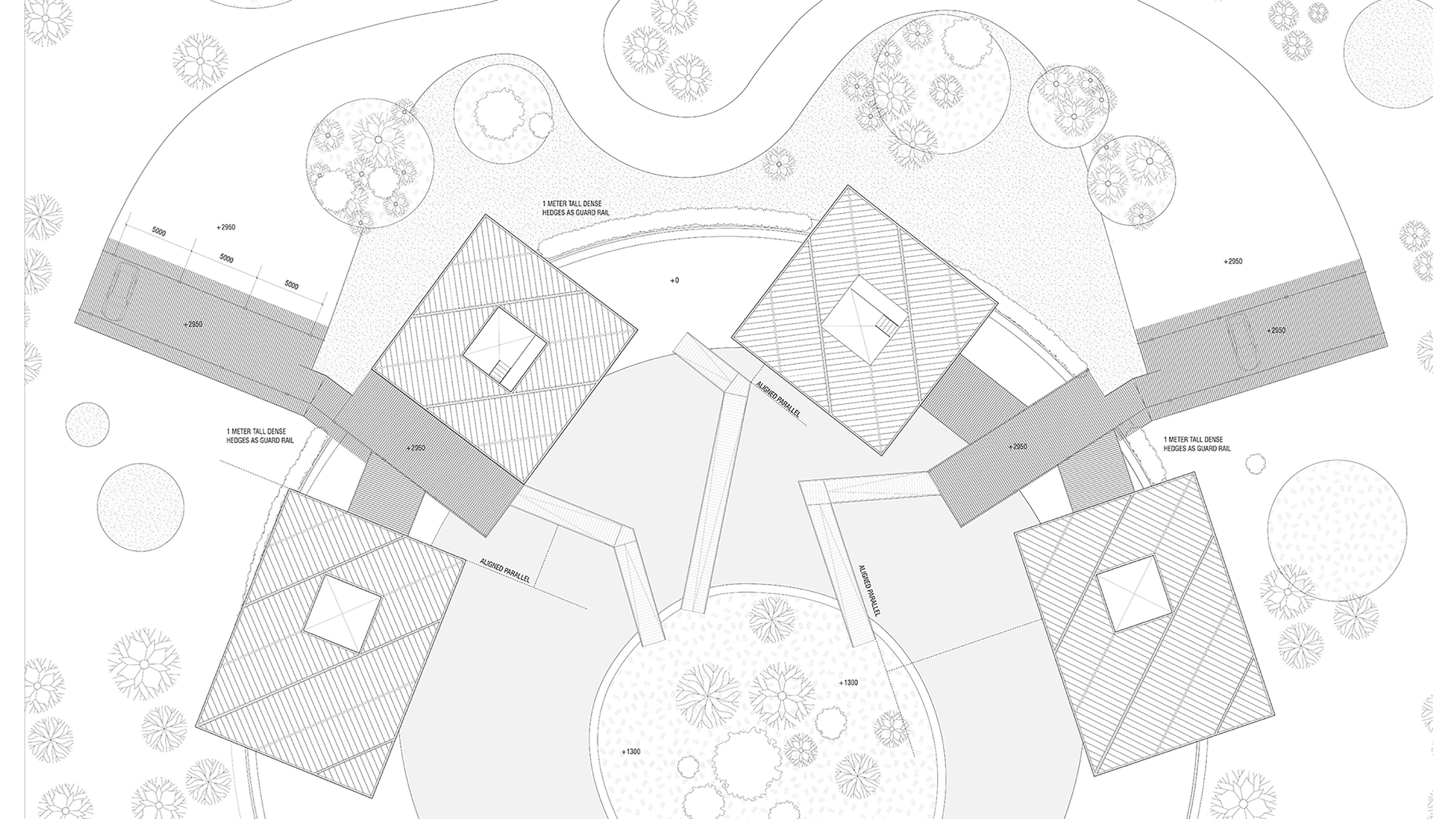 The design synthetically integrates the wisdom of the regional vernacular with the complexity of the social program. The exterior of shaded terraces and the interior are interwoven. The ground level, beneath the living units defined by pilotis on one side and the retaining wall on the other is fully opened to the lake and the garden. Dispersed around the artificial ring-shaped lake, each housing is designed to fully engaged the landscape. Each cluster has neither front nor back, each becomes an object in the landscape. The oblique gables obscure the typology of the traditional gable, allowing them to be perceived from all perspectives.
