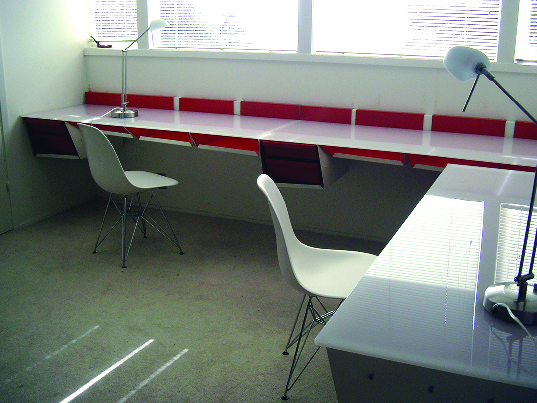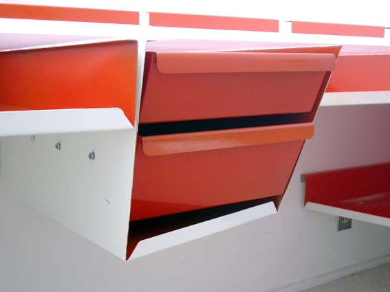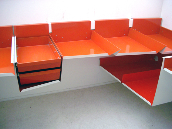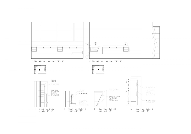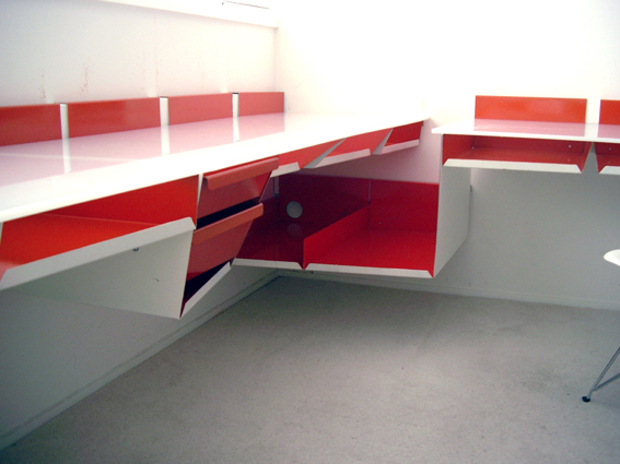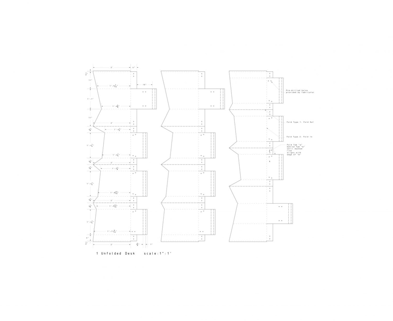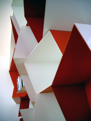 In the design of the bookshelves, the same pattern of sheet metal cut is designed to achieve formal and spatial variation depending on the direction of the fold. Color is used to give clues to the surface folding assembly, to trace the method of fabrication, and to project possible surface operation. Folds give material lateral and sheer strength, while organizing spatial flow for storage and efficient work surface. Even though the design is for specific function to be installed on the specific site, it has been both clients and our intentions to conceptualize the system of modules in design, fabrication, and installation methods for the ease of transportability and to achieve the aesthetics of accumulative result.