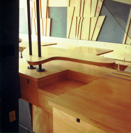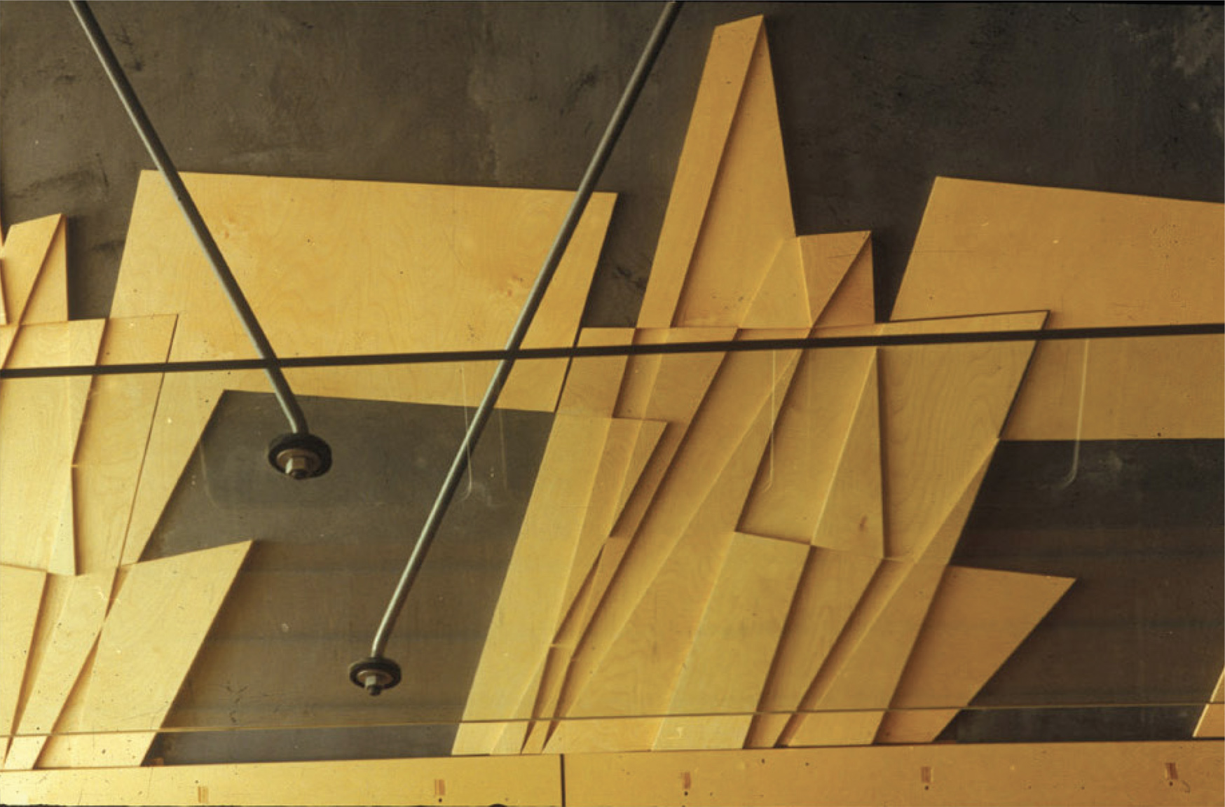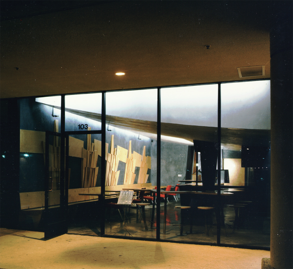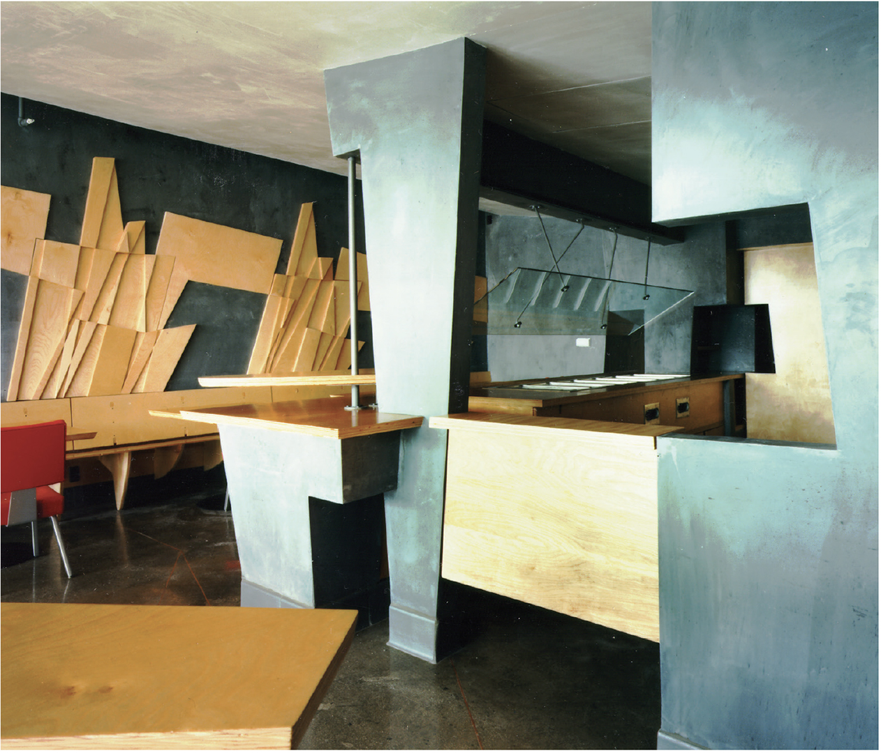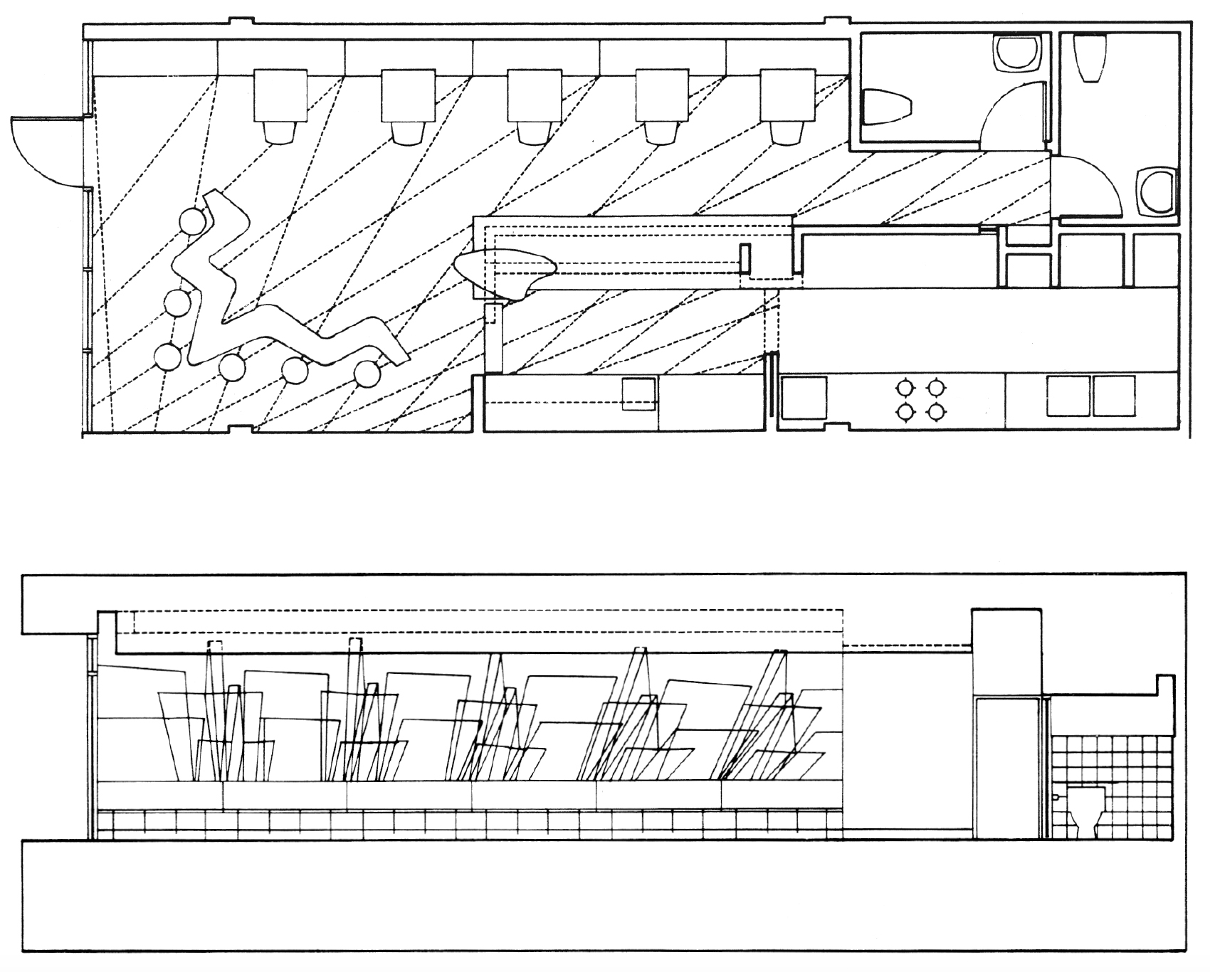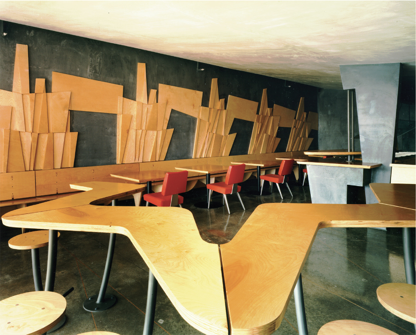 This intimate cafe is designed and developed through multiple privileged points of view. By striking multiple lines of possible glances running through floor and wall of the cafe, two principle interior elements are brought into close visual relationship; a serpentine dining counter bar, and continuous wall bench. Designed to maximize the depth of this small 800 sqft space, dynamic sectional qualities are revealed throughout the cafe at different points of its interior.