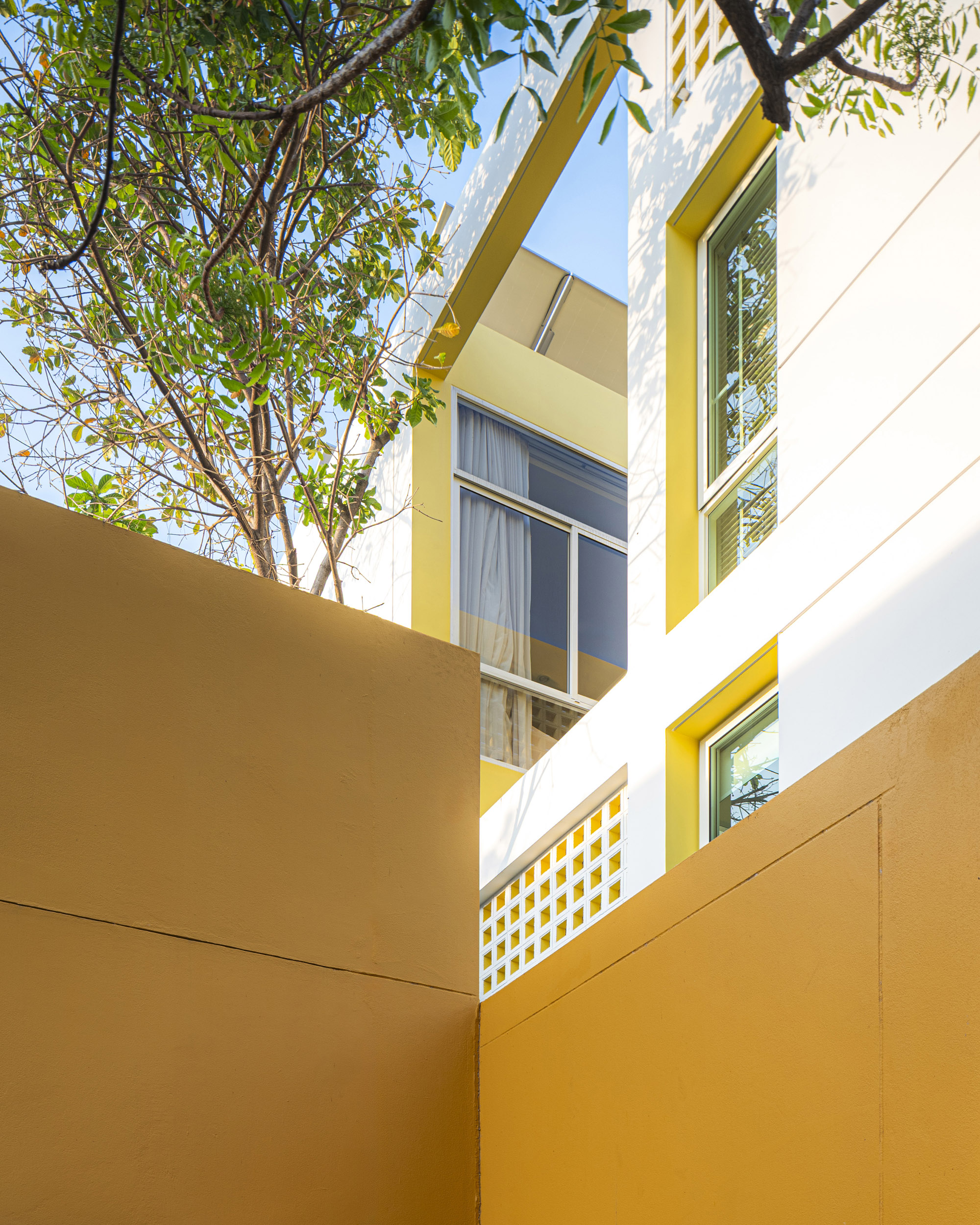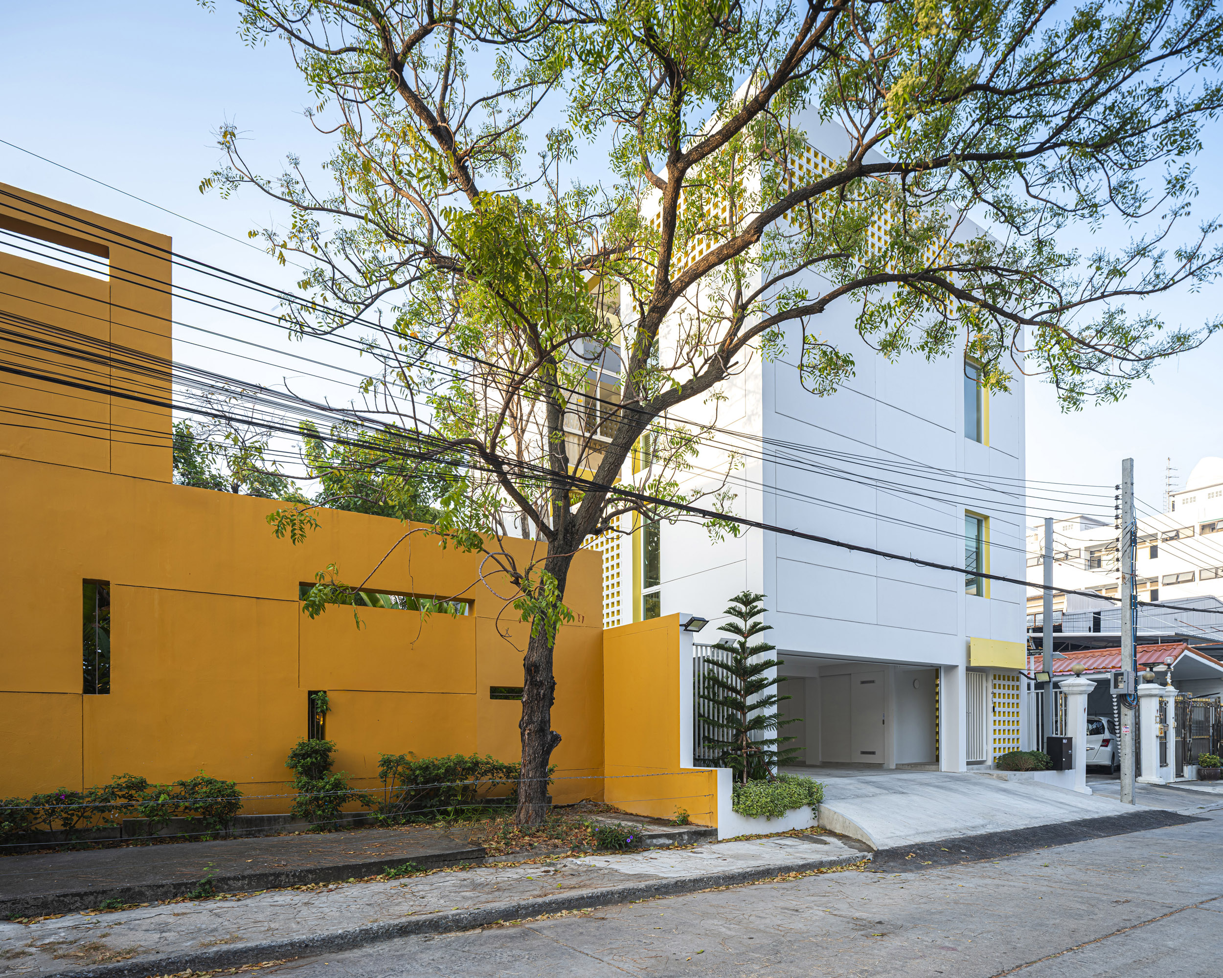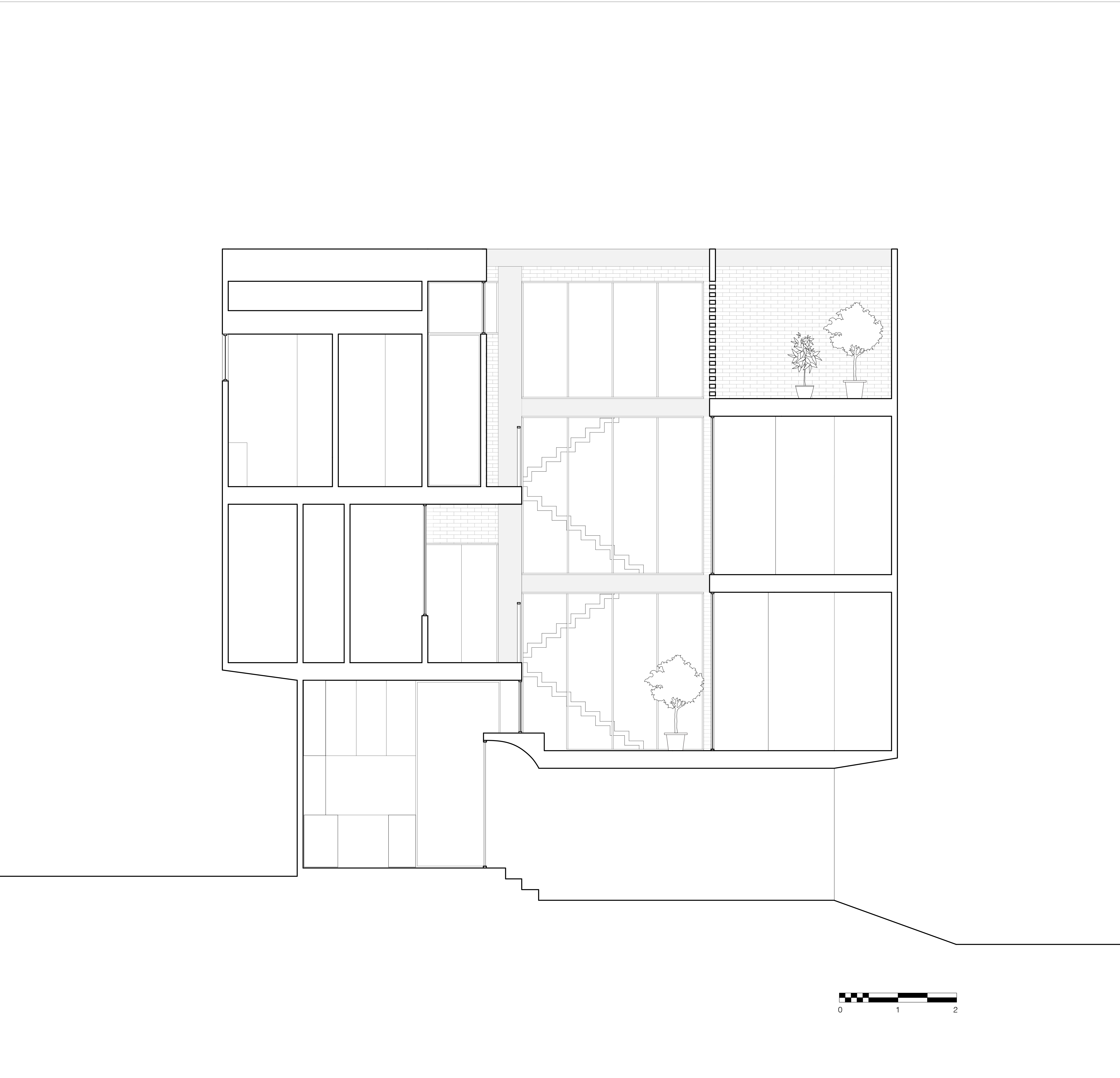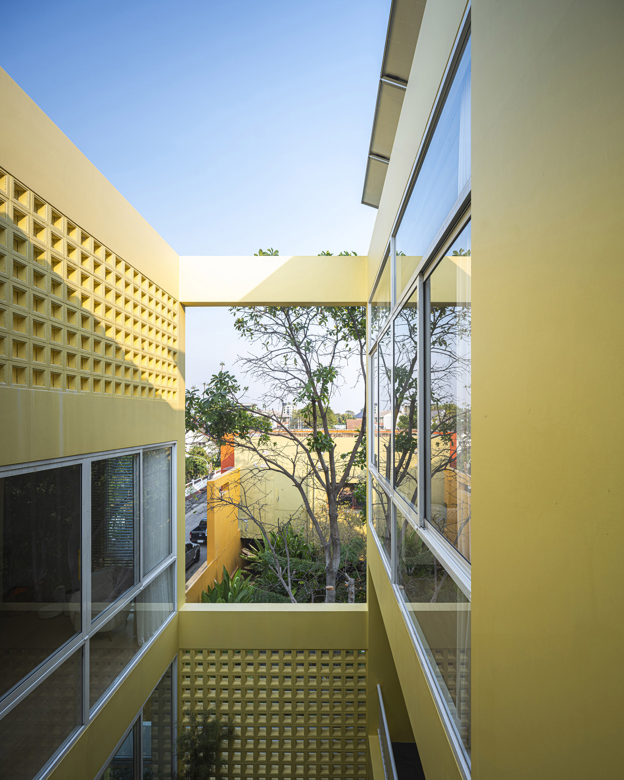 The house is built on an unusual subdivision of 12m X 7.50 m lot size in a small alley of Bangkok dense urban neighborhood. The north end of the property is the only access to the public alley way. To the east and the south of the property, lies the garden of the neighboring homes of the same extended family. The Inward house take advantage of this unique site by re-introducing a “courtyard” typology. To maximize the square footage of the usable space, the house is built right on the lot line and wrapped around a carved-out open courtyard in the interior. The architecture acts as a buffer between the bustling City and the quiet refuge of the interior. Each interior space facing inwardly toward the courtyard. The house is also taking advantage of the neighboring garden space for natural ventilation. The porous deep grey brick wall around the courtyard induces airflow as a natural cooling and ventilating while providing privacy for the residence.