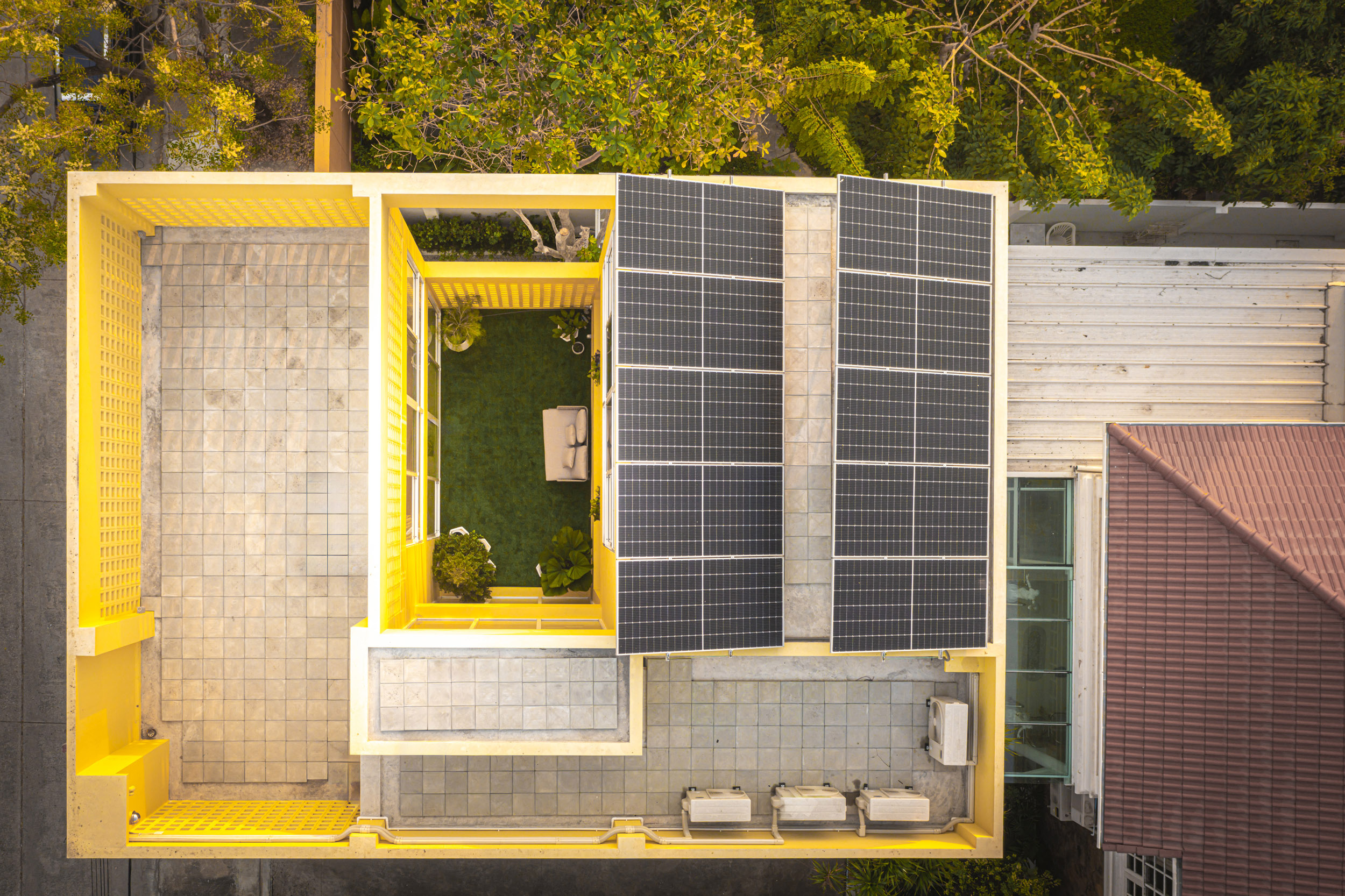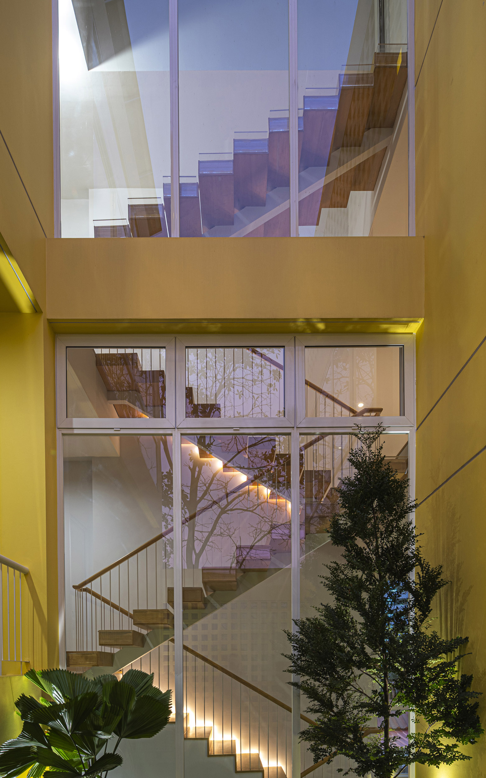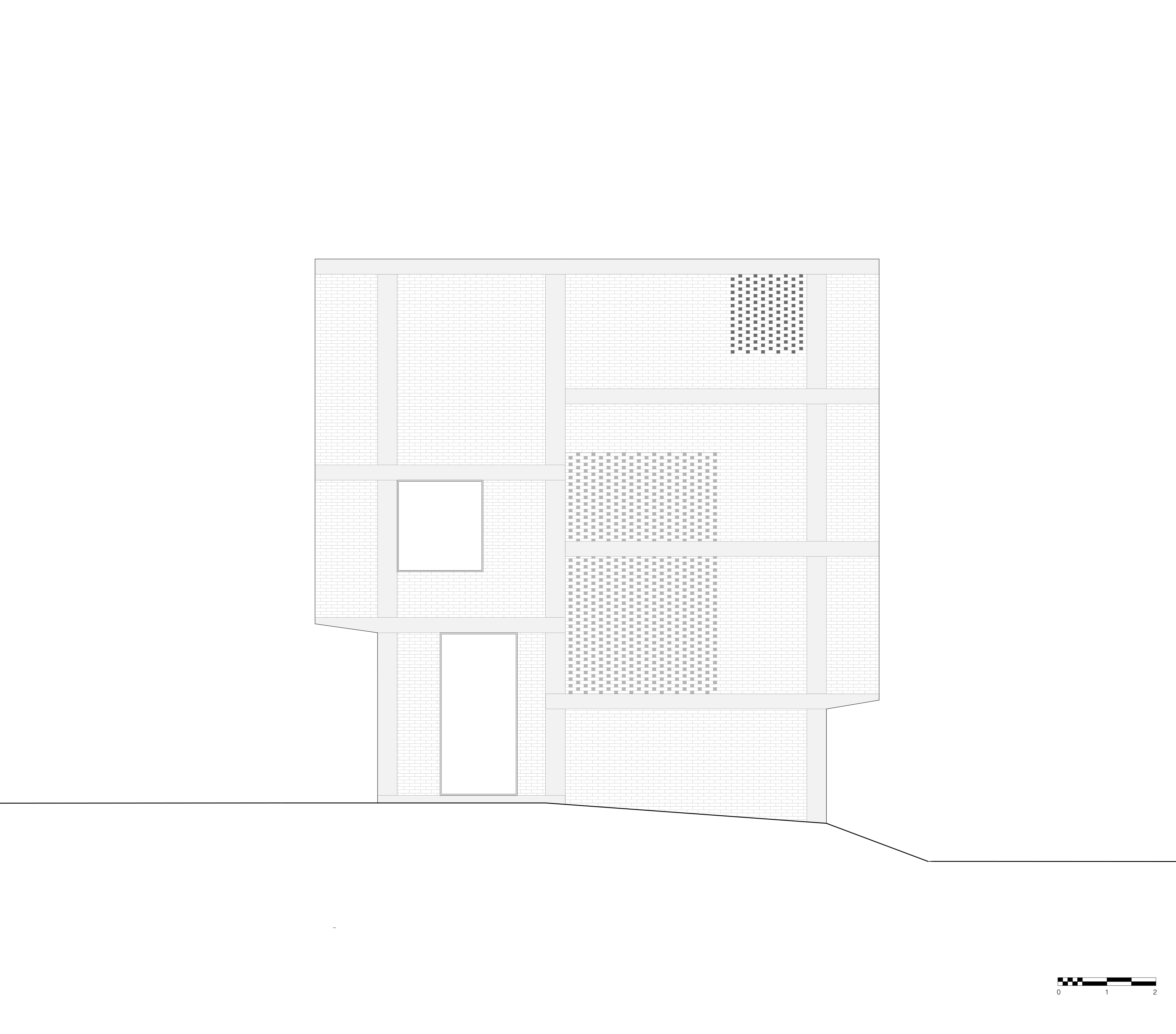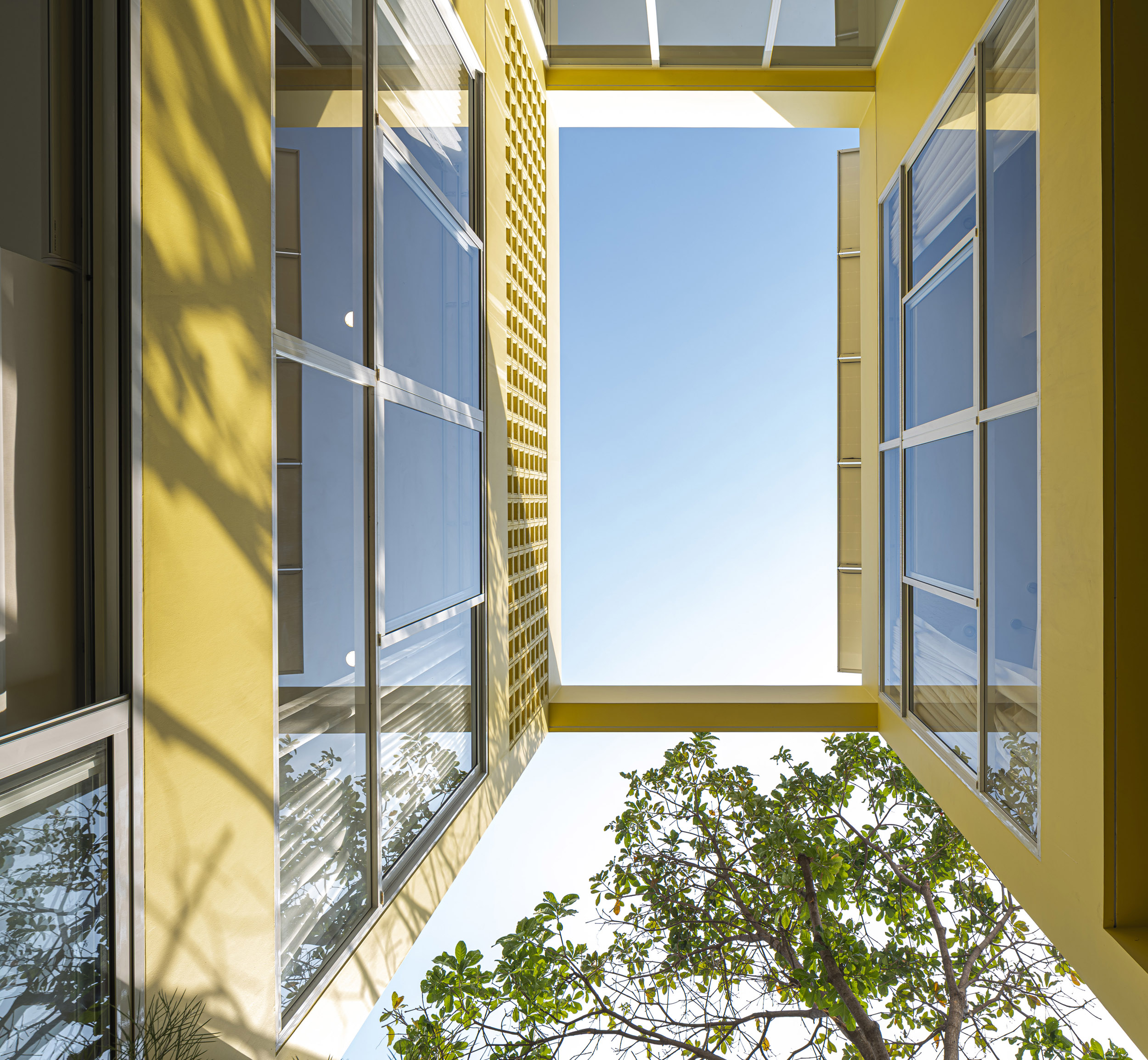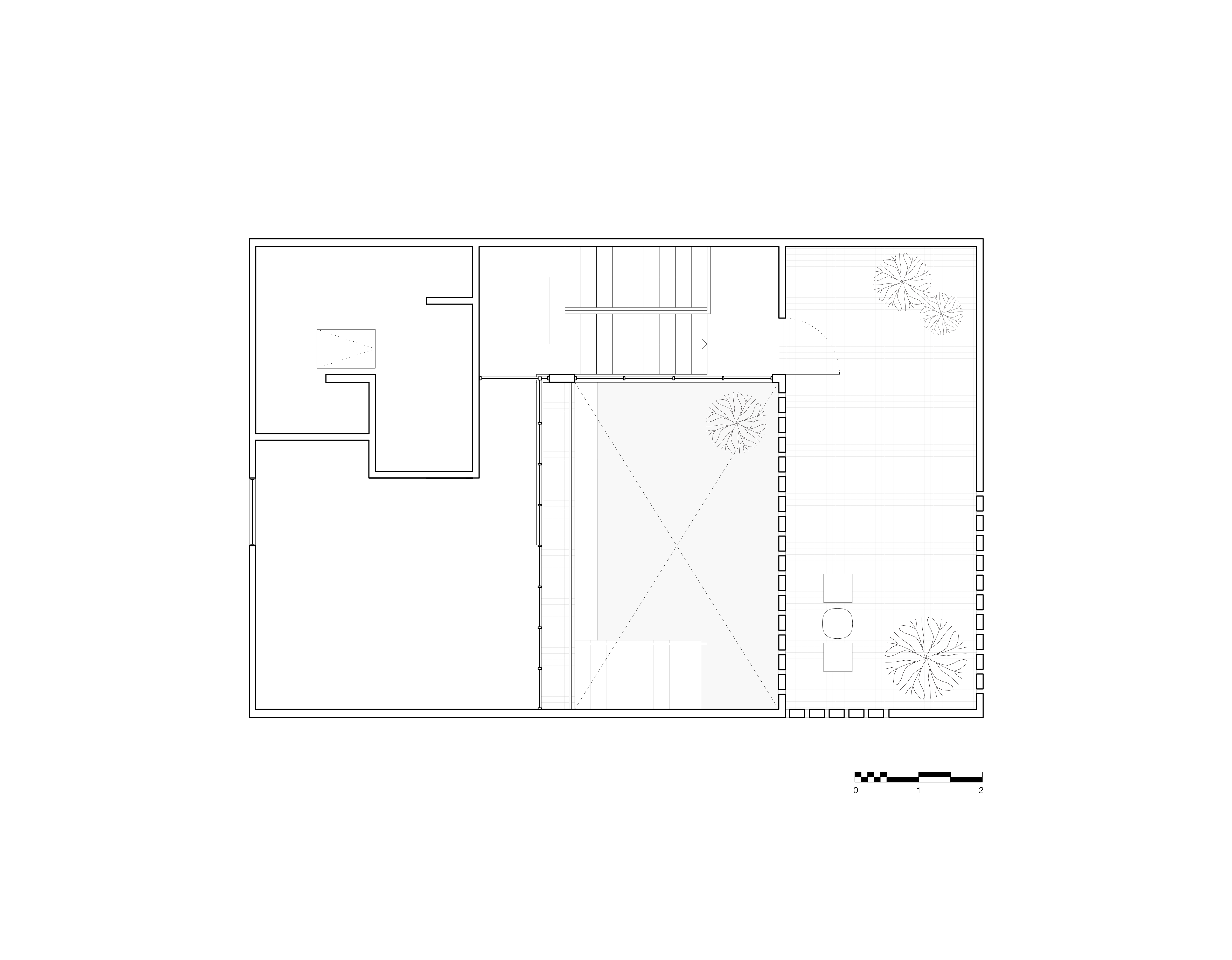 The house is built on an unusual subdivision of 12m X 7.50 m lot size in a small alley of Bangkok dense urban neighborhood. The north end of the property is the only access to the public alley way. To the east and the south of the property, lies the garden of the neighboring homes of the same extended family. The Inward house take advantage of this unique site by re-introducing a “courtyard” typology. To maximize the square footage of the usable space, the house is built right on the lot line and wrapped around a carved-out open courtyard in the interior. The architecture acts as a buffer between the bustling City and the quiet refuge of the interior. Each interior space facing inwardly toward the courtyard. The house is also taking advantage of the neighboring garden space for natural ventilation. The porous deep grey brick wall around the courtyard induces airflow as a natural cooling and ventilating while providing privacy for the residence.