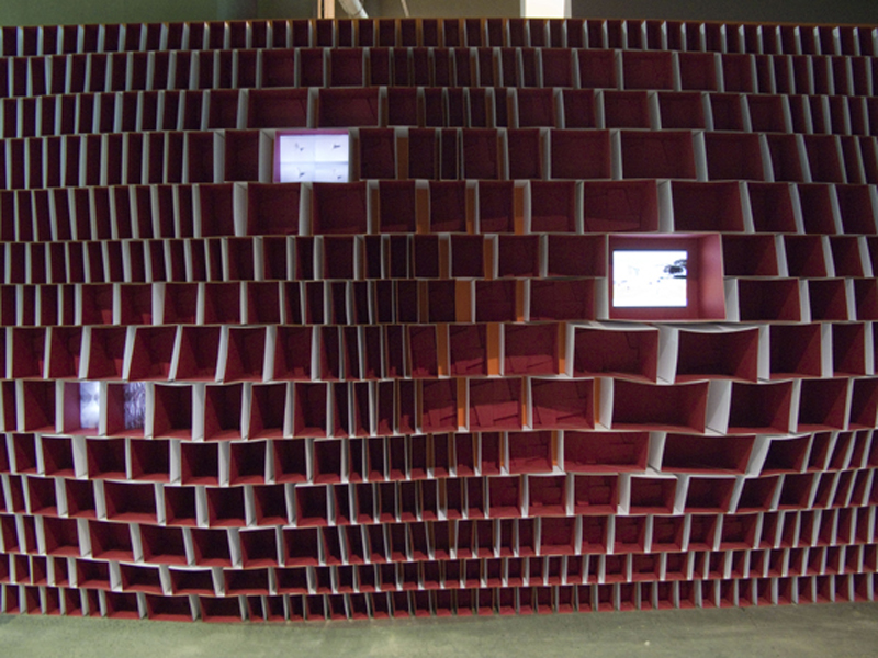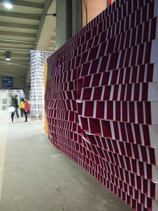 This installation takes Koolhaas’ critique of almost a decade earlier on a different trajectory. A large percentage of our built environment is dedicated to managing, reorganizing and reutilizing material resources. At the same time, we are also coping with the urge to accumulate “stuff,” both physical and informational. We can hardly keep track of the piles of our essential “collectables” and “memorabilia” on a daily basis. RAM Wall proposes a system of storing/archiving information, suggestive in its capacity for providing both physical and digital storage. It attempts to propose a system that is capable of reorganizing, reshuffling, and/or retelling information. “Patterns imply repetition or ultimately decipherable rules: Junkspace is beyond geometry, beyond pattern. Because it cannot be grasped. Junkspace cannot be remembered. It is flamboyant yet unmemorable, like a screen saver, its refusal to freeze insuring instant amnesia….” Rem Koolhaas, “JunkSpace” As opposed to “JunkSpace,” this installation offers an alternative view of our overabundant material culture by exploring the logic of simple and familiar use of conventional material. In doing so, we create “Patterns (that) imply repetition or ultimately decipherable rules” and ensure that the material information “be remembered.” A utilitarian and basic folding unit that resembles a standard manufactured cardboard box accretes like masonry wall, yet variations are given to the depth and spacing of individual modules by means of mass customization.
