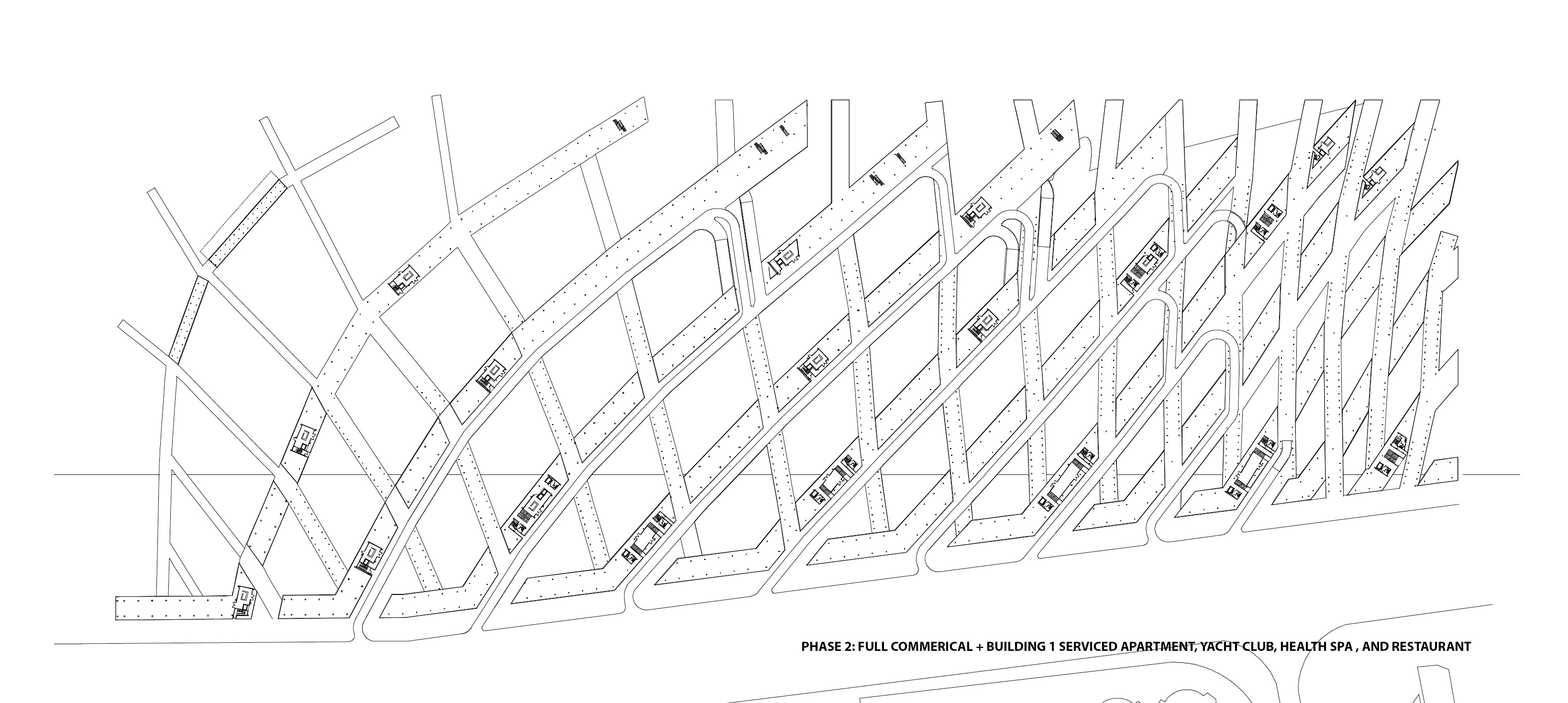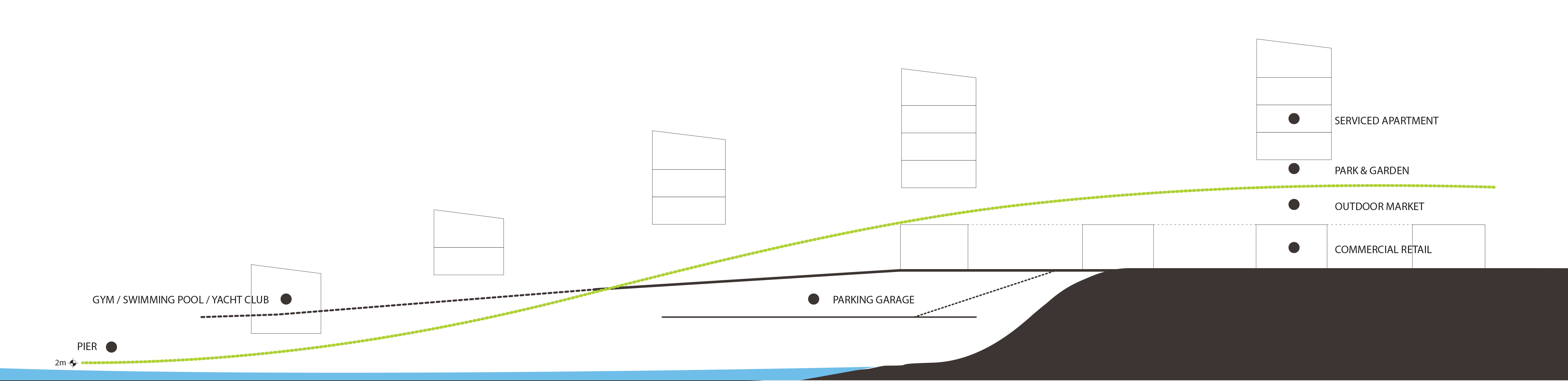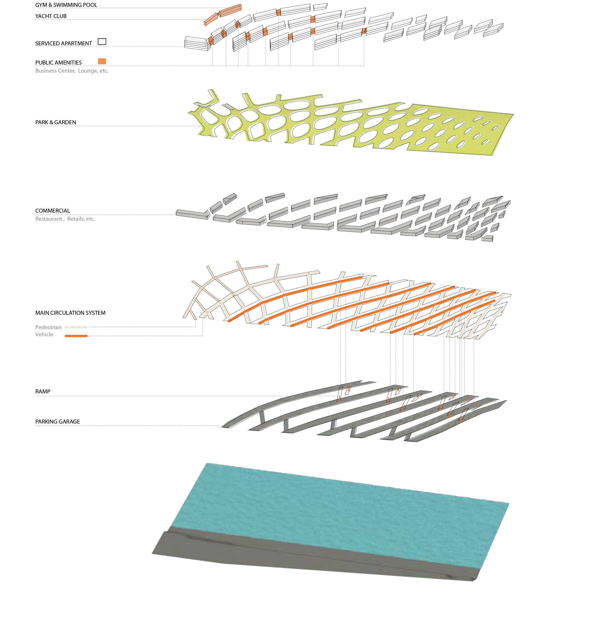 Two main programs, commercial retail and serviced apartments, are strategically located within this diamond grid system, taking the most advantage of the site!s vulnerability and beauty. The diamond grid system provides great porosity to such a large development. The development is rhythmically divided into smaller enclaves, allowing one to engage with it on a human scale. About five meters above the retail volume lies a horizontal surface defined as an artificial rolling landscape of park and garden. Strategically situated, this rolling landscape identifies the clear boundary between the public program of commercial retail and the private program of residential serviced apartments. It also provides shade to the outdoor market (the rooftop space of the actual retail enclave) right below it, which is most desirable in such hot climate as in Hainan Island.