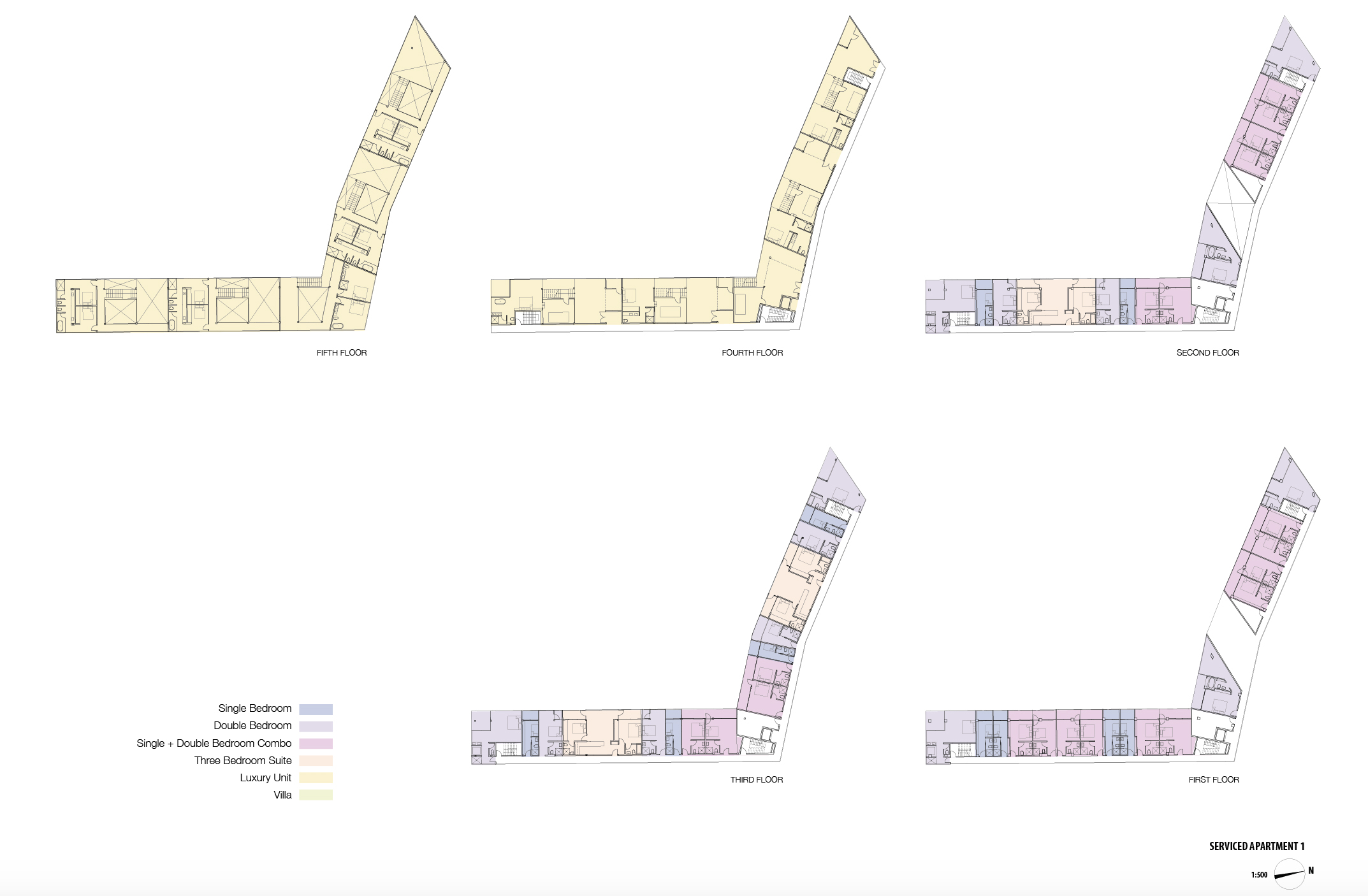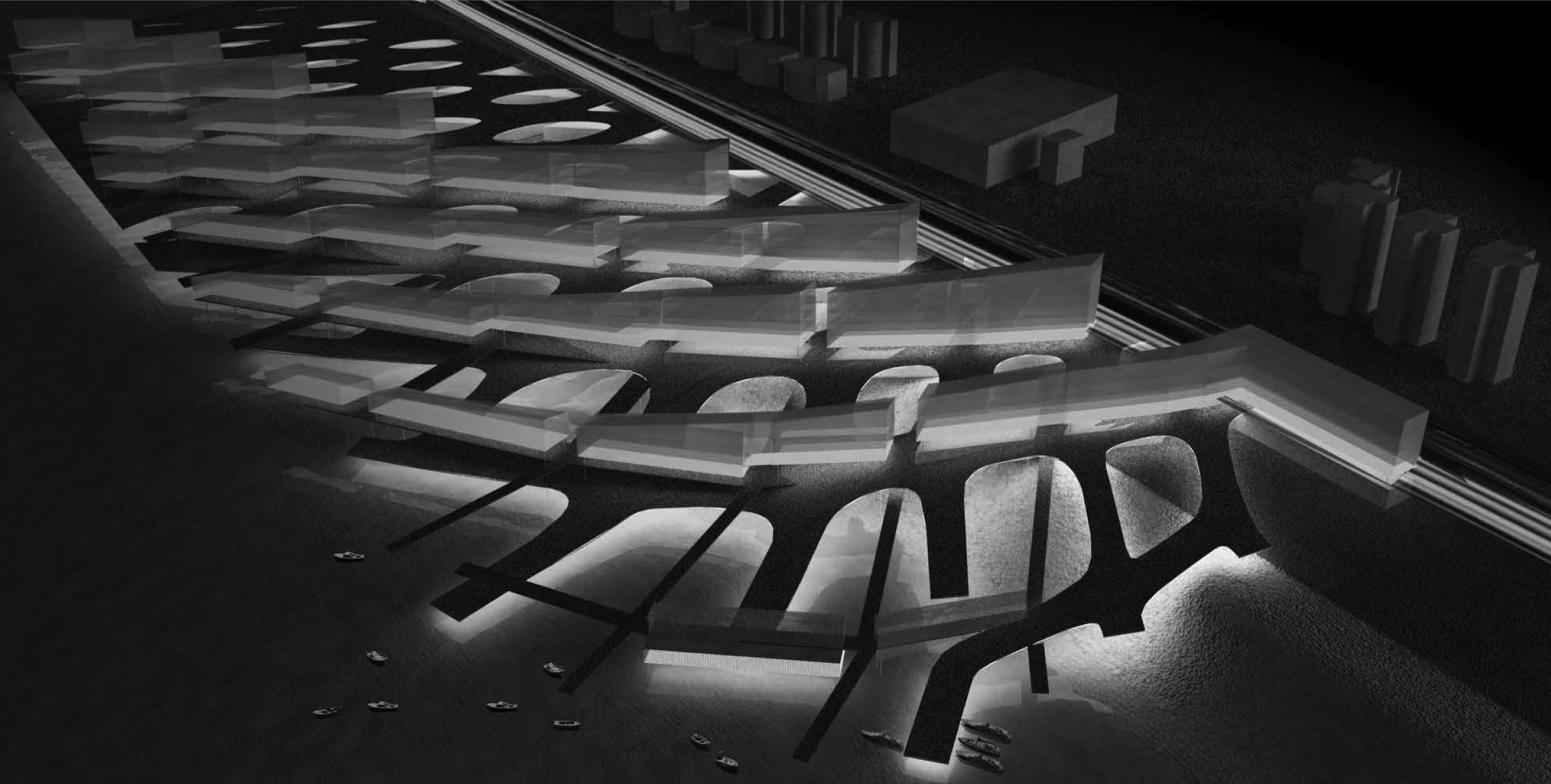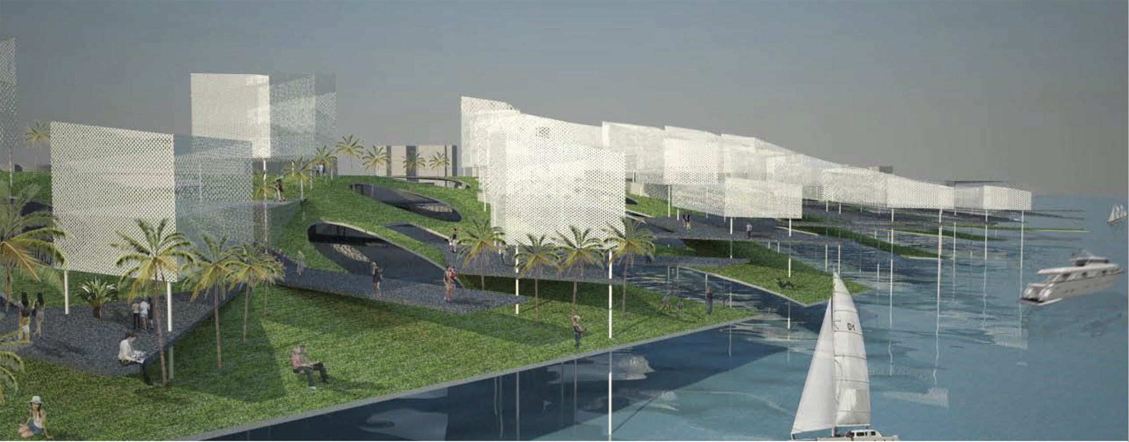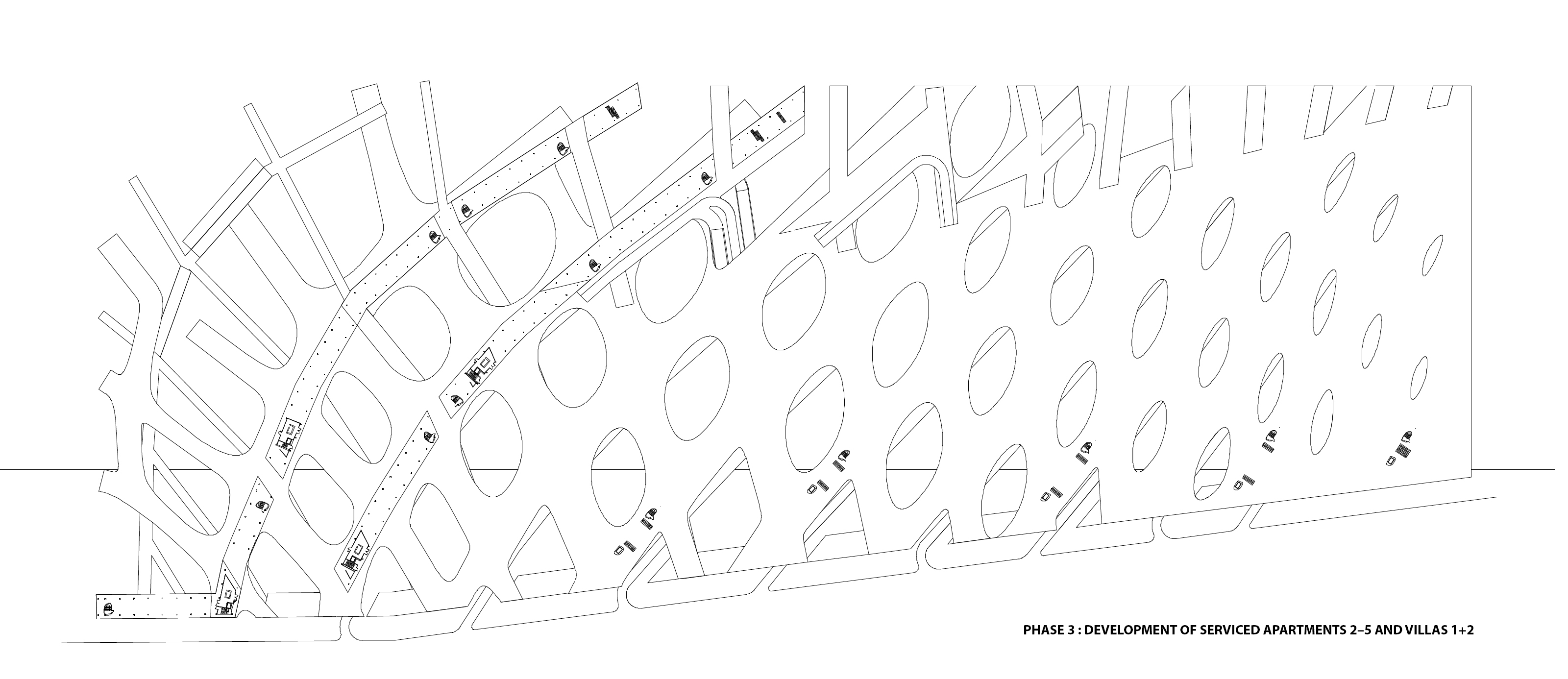 Two main programs, commercial retail and serviced apartments, are strategically located within this diamond grid system, taking the most advantage of the site!s vulnerability and beauty. The diamond grid system provides great porosity to such a large development. The development is rhythmically divided into smaller enclaves, allowing one to engage with it on a human scale. About five meters above the retail volume lies a horizontal surface defined as an artificial rolling landscape of park and garden. Strategically situated, this rolling landscape identifies the clear boundary between the public program of commercial retail and the private program of residential serviced apartments. It also provides shade to the outdoor market (the rooftop space of the actual retail enclave) right below it, which is most desirable in such hot climate as in Hainan Island.