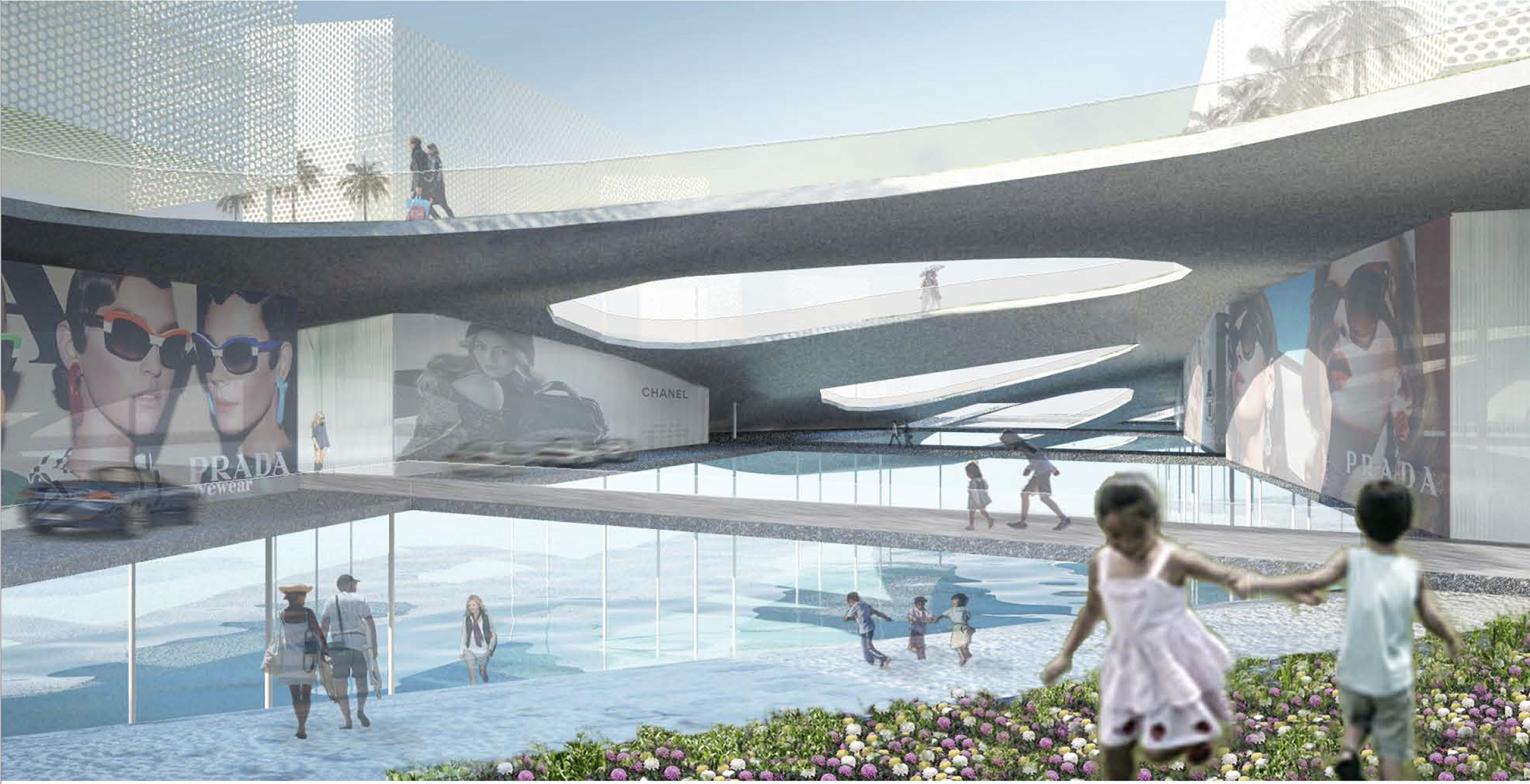 The diamond grid system will be built on stilts, allowing erosion and flood tides, and other natural phenomena to take place. The diamond grid system will determine programmatic arrangement and bend towards the orientation of the prevailing wind to maximize natural ventilation. The architecture becomes instrumental in gauging nature, not controlling it.... allowing humans to observe and experience its impermanent beauty. One can physically and visually experience the fluctuation of the sea level below while moving along the pedestrian walkways through the enclave of retail with an ocean view and the open sky at the end of each walkway.