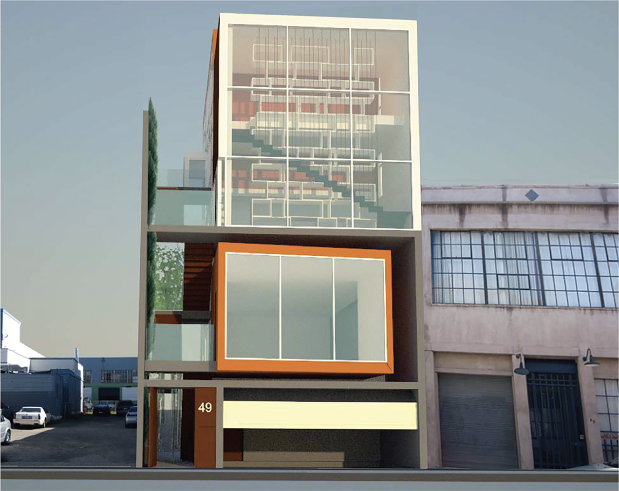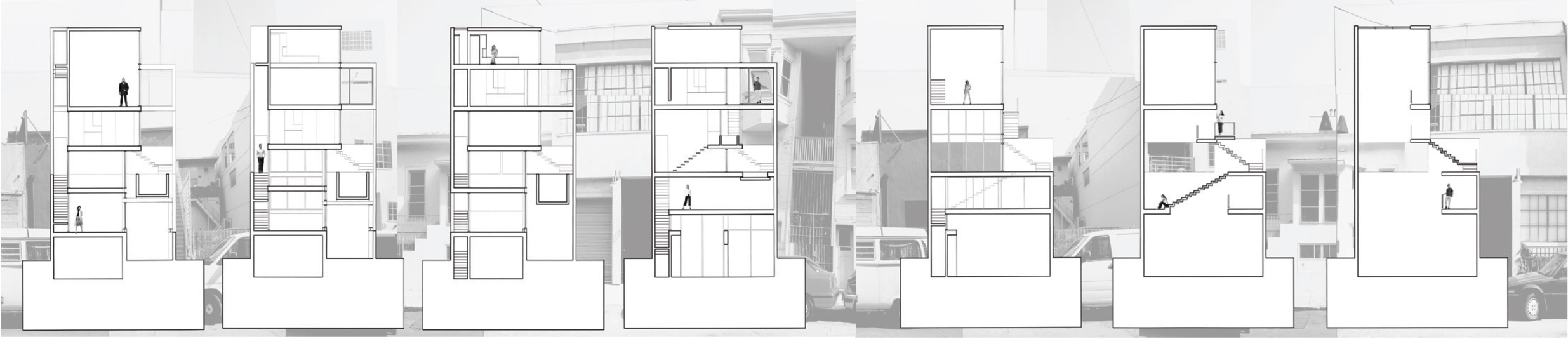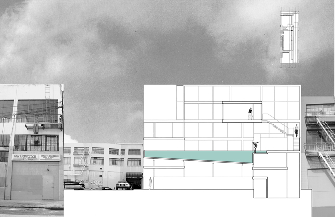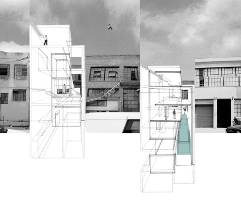 Two units of live/work space are wedged into a narrow mid-block site in a dense, industrial part of the city of San Francisco. The only feasible way to meet the demand for space is to maximize the square footage within the possible minimum lot size, provided that the maximum square footage is allowed by city zoning constraints. Similar to the act of opening the lid of the suitcase, the southeast "party" wall is pushed away from the lot line to allow the only source of light and air into the interior volume and create a "shared volume." Observing the passage of liquid through a small opening in a test tube, "flow" is seemingly reduced by pressure from below. The remaining liquid in the tube clings to the side surface as a result of molecular attraction slowing its movement further. This series of experiments has become the internal logic guiding the design of space, volume, and flow.