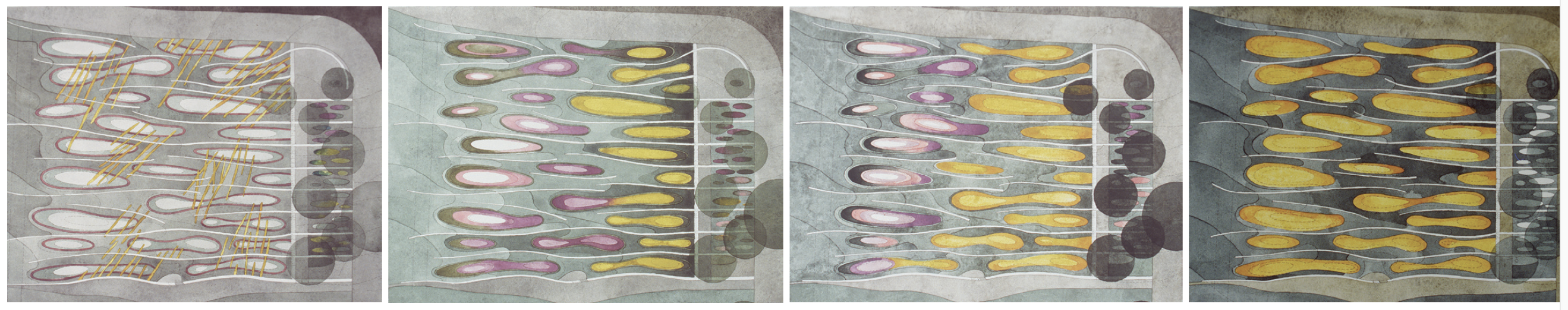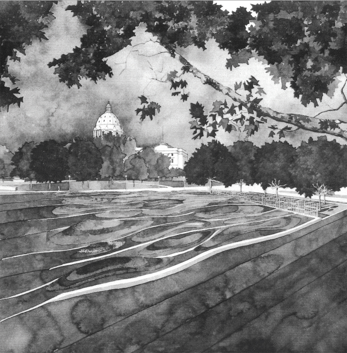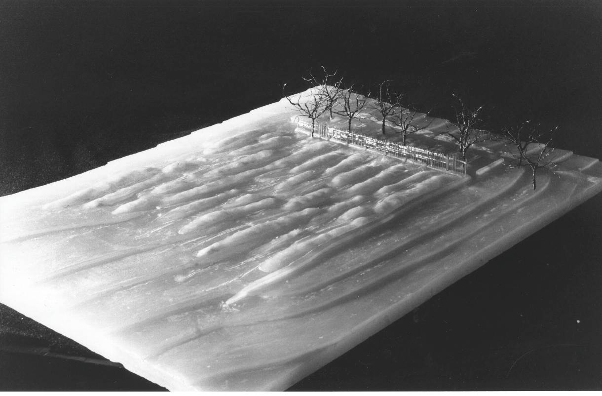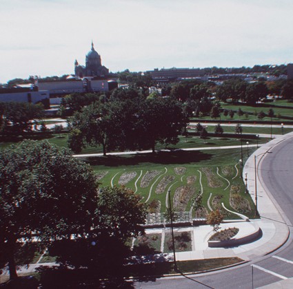 West of the interwoven trellis, the prairie landscape recedes perspectivally, with rough stone striations metering the field like glacial marks in the face of limestone bedrock. These striations run perpendicular to the trellis and are revealed in true orientation to the last glacier that moved across this site. Working with a local horticulturist to select the native prairie plants with an exception of yellow Daffodils, to control the color change throughout the year. Lines of Daffodils march uphill tracing the geological scratches towards the capitol for two weeks every spring.