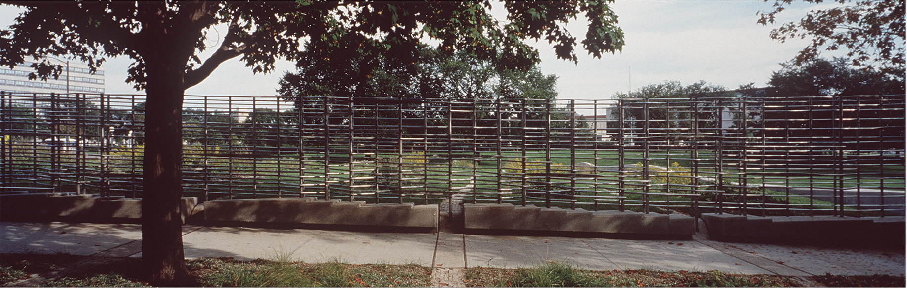 Evidence of political time: the stainless steel woven trellis marks the beginning in 1848 when Seneca Falls convened, to the ratification of the 19th amendment in 1920. Every vertical rod marks a year of struggle and every horizontal rod follows the individual lifeline of each recognized suffragist who brought about such monumental change in the political landscape.